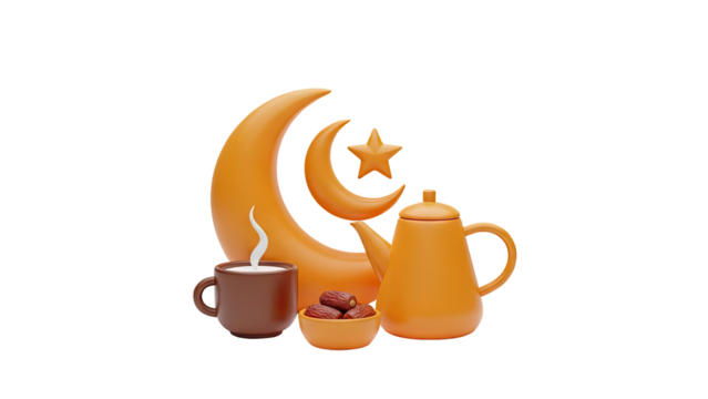 Ramadan Iftar elements: moon, star, dates, coffee and teapot on transparent background