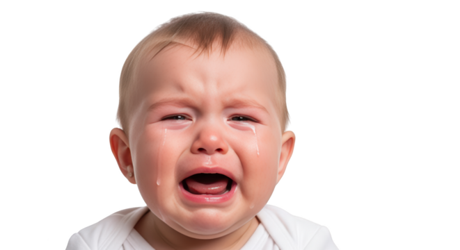 Toddler baby crying, tearful child face close-up, isolated on a white background