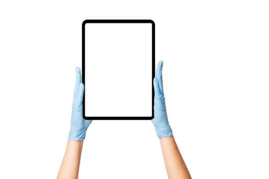 Hands in medical gloves holding an electronic tablet on an empty background. Telemedicine, healthcare applications, digital health solutions.