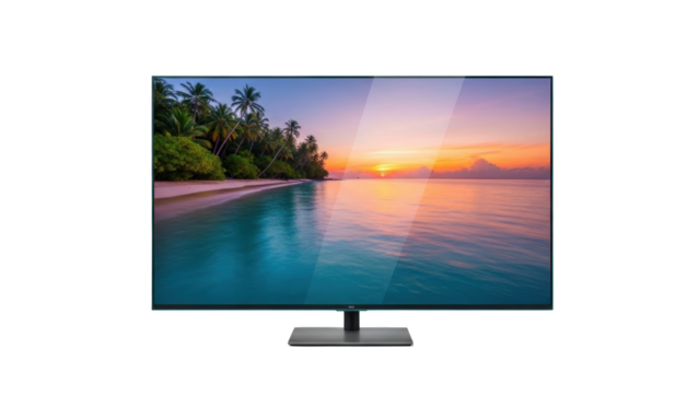 Isolated modern flat screen television set displaying a sunset beach landscape image