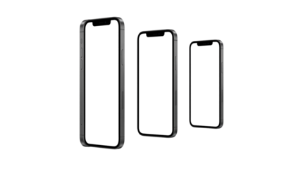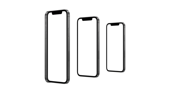 Three black smartphones with blank screens in different sizes on white background for mockup or template usage