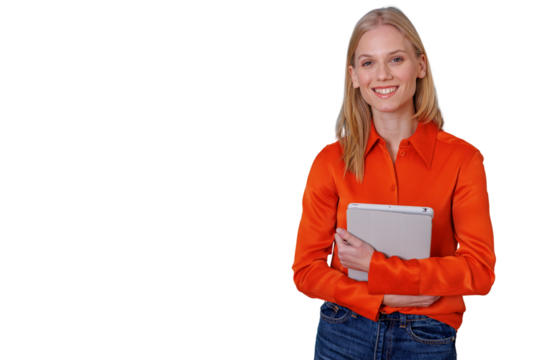 Blonde woman wearing an orange shirt and jeans, smiling while holding a digital tablet, representing business and casual tech use