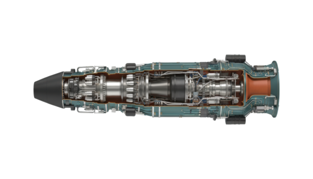 Detailed cross-section of a jet engine shows the intricate internal mechanics, compressor blades, and combustion chamber in a technical illustration style