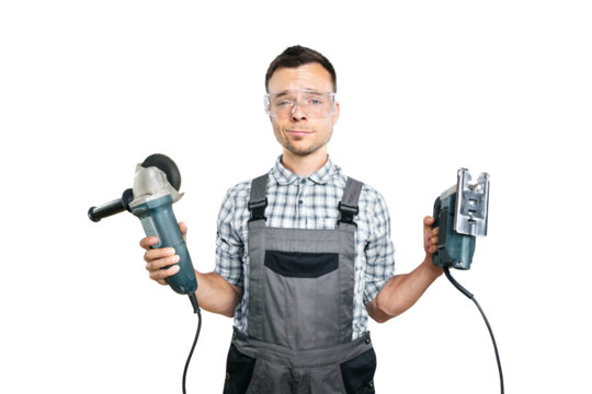 A professional tool for work, repair and construction in the store, isolated on white background. Sale of wired power tools and battery powered equipment in the shop