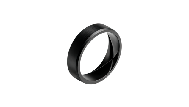 A close-up, isolated view of a sleek, black ring.  The ring's  smooth, matte finish is highlighted against a pure black background.  Its circular form is emphasized