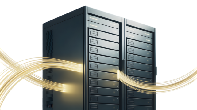 Server Racks with Golden Light Trails, Data Transfer Concept, Modern Technology, Dark Background