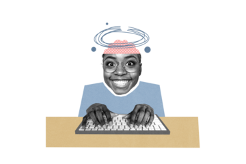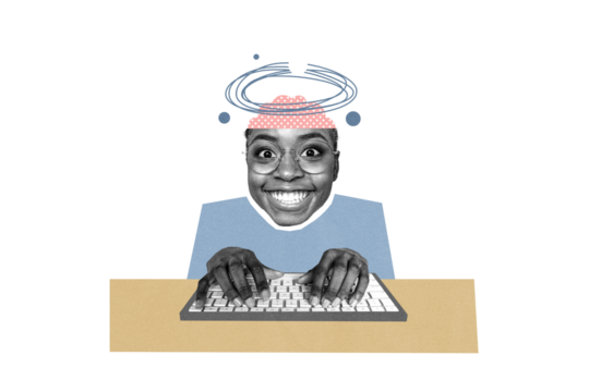 Creative collage picture young crazy woman worker nerd keyboard user brainstorming clever smart genius mind drawing background