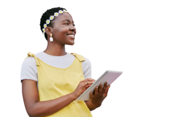 Idea, tablet and smile with a black woman isolated on a transparent background for social media. Thinking, technology and happy with an attractive young african person browsing the internet on PNG