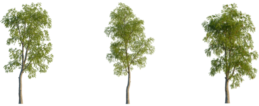 Callistemon viminalis tree, front view, cutout, transparent background, isolate, Three isolated green trees on a transparent background.