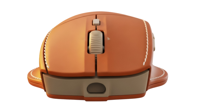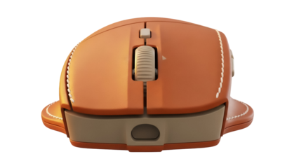 Ergonomic orange computer mouse isolated PNG on transparent background, wireless input device for graphic design and office use