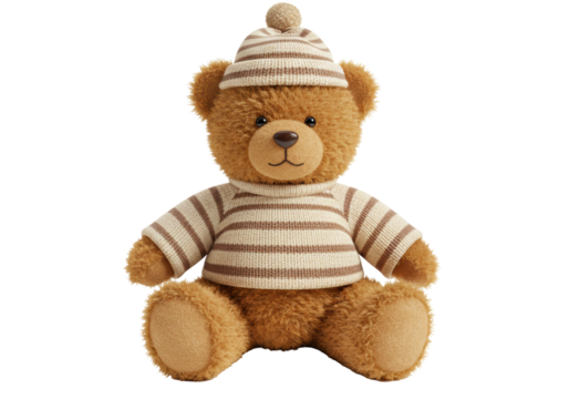 Isolated Cute Teddy Bear Wearing Striped Sweater and Hat