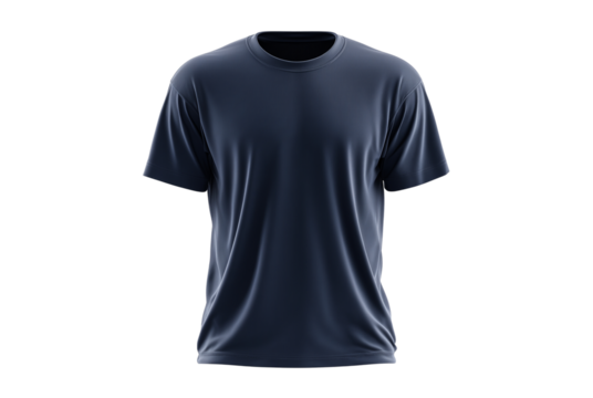 Two views of a dark blue t shirt with short sleeves and a round neck on a black background studio shot
