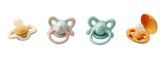 Assorted Baby Pacifiers in Various Colors and Designs on White Background, isolated on transparent background