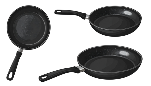 Collection of Three Modern Black Frying Pan Concepts, isolated on transparent background PNG
