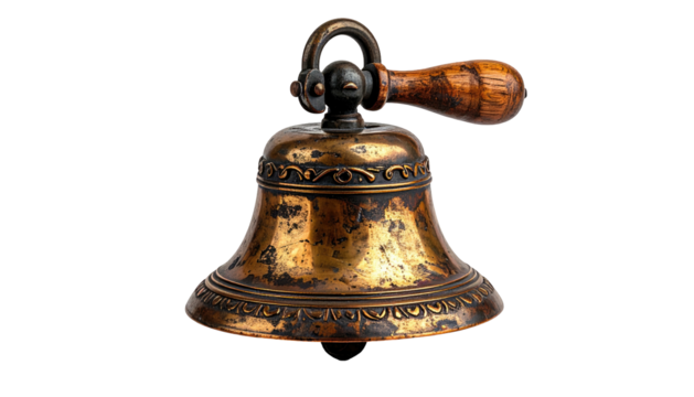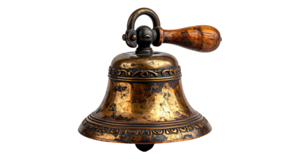 Antique brass bell with wooden handle and a golden shine, set against a black backdrop