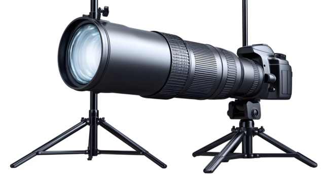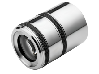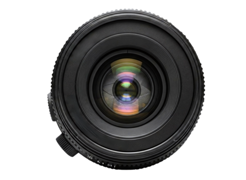 Close-up of camera lens for photography isolated on white background or transparent png, detailed optical equipment for capturing sharp images.