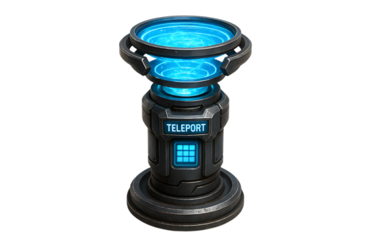 Futuristic teleportation device generating bright blue energy beam, glowing with sci-fi technological innovation against transparent backdrop