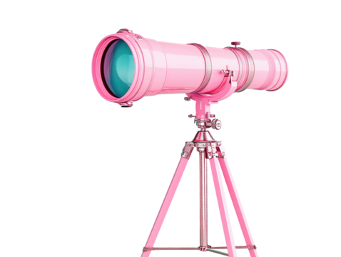 Pink telescope on tripod isolated on turquoise background.. PNG transparent.