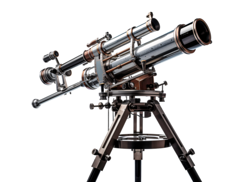 Vintage wooden telescope with brass finishes on a sturdy tripod stand, isolated on white background, perfect for exploration and astronomy themes.