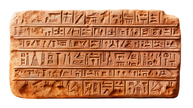 A weathered stone block etched with intricate Egyptian hieroglyphs, telling stories of ancient history and mysterious messages