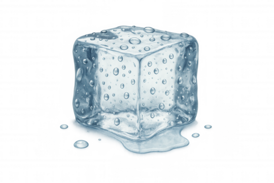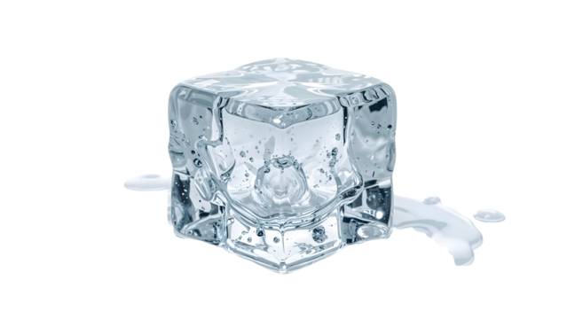 Ice cube thawing, water droplets forming, cold refresh concept, isolated transparent background