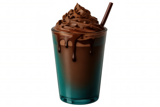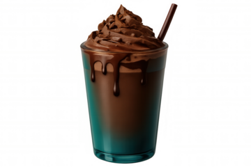 Chocolate milkshake cascading over glass rim, generously crowned with whipped cream and drizzling chocolate sauce against transparent backdrop