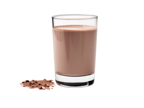A glass of chocolate milk with chocolate shavings on a in a studio shot on transparent background
