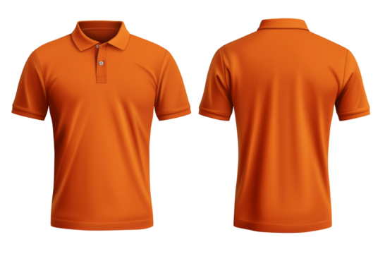 An orange polo shirt with a front and back view, featuring short sleeves and a classic collar style, on a transparent background