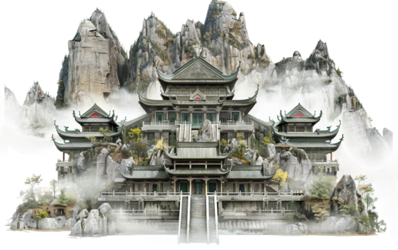 Ancient Chinese Architecture A Stone and Timber House in the Mountains isolated on transparent baackground