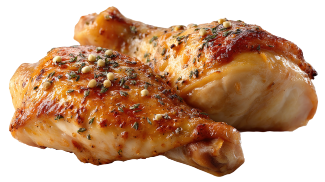 Golden Roasted Chicken Legs: Savor the succulent allure of two golden-brown roasted chicken legs, meticulously seasoned with herbs and spices. A tempting culinary delight.
