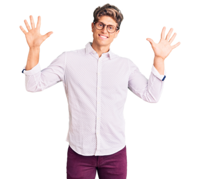 Young hispanic man wearing casual clothes showing and pointing up with fingers number ten while smiling confident and happy.