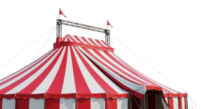 Bright red and white striped circus tent cutout isolated on transparent bg, png