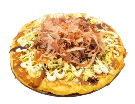 Delicious Japanese Okonomiyaki pancake with sauce, mayo, and katsuobushi, with one slice cut out, Isolated on Transparent and White Background