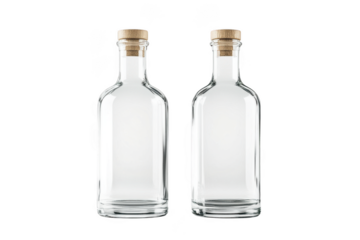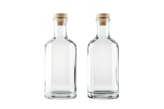Two empty glass bottles with cork stoppers mockup, liquid container, beverage packaging, still life, product presentation isolated on transparent background