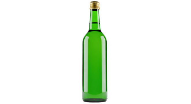 Isolated green glass bottle with golden cap for alcoholic drink, spirit or beverage shot