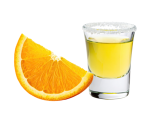 Orange slice next to shot glass of liquid