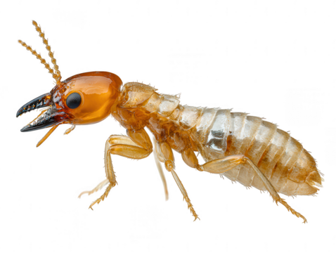 Termite close up: A detailed photograph captures a termite in sharp focus, showcasing its distinctive features against a neutral background.