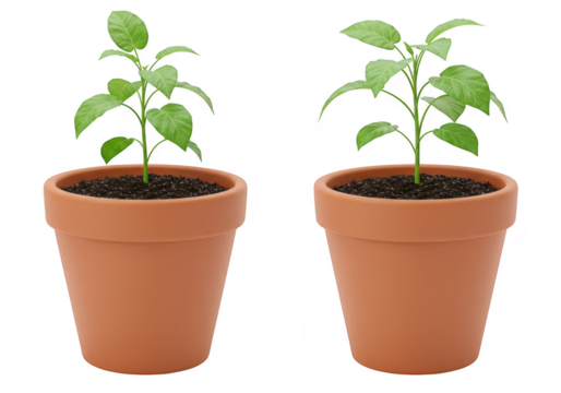 Two young green plants growing in terra cotta pots, isolated on transparent background