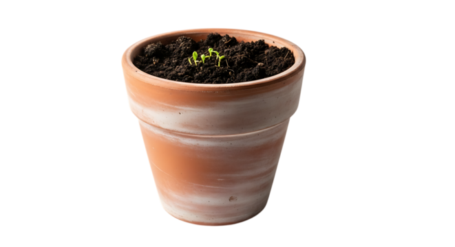 Young green sprouts growing in terra cotta pot