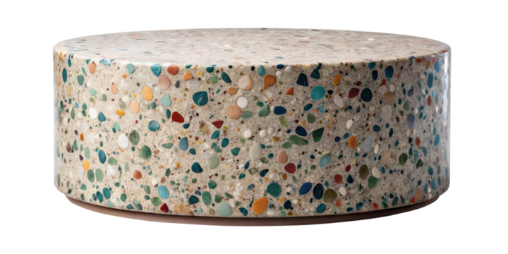 Large round terrazzo pedestal featuring multicolored chips, offering a vibrant and artistic design. Ideal for modern and creative decor or display settings. Isolated on transparent background, png.