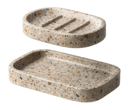 Terrazzo bathroom accessory set with a speckled design, featuring a soap dish and a small tray, ideal for a stylish city apartment.