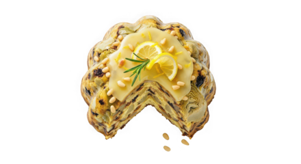 Savory rice terrine topped with creamy sauce and fresh garnishes