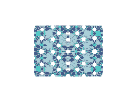 A vibrant geometric pattern featuring a kaleidoscope of blue and black shapes on a solid black background