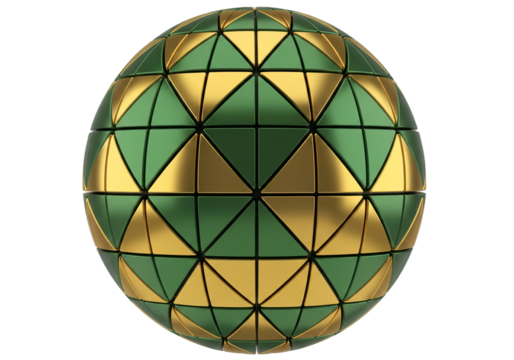 Geometric Sphere with Interlocking Green and Gold Triangular Panels