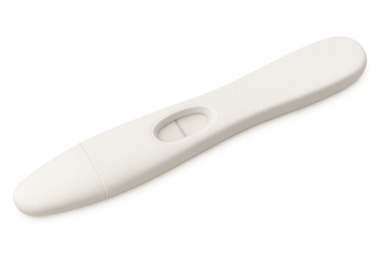 Woman's hand holding a pink and white digital pregnancy test isolated on a transparent background female