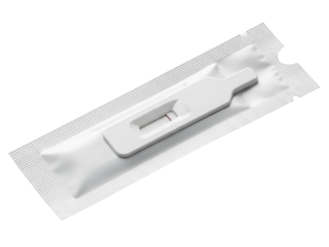 Rapid diagnostic test kit in a sealed sterile foil package on a transparent background