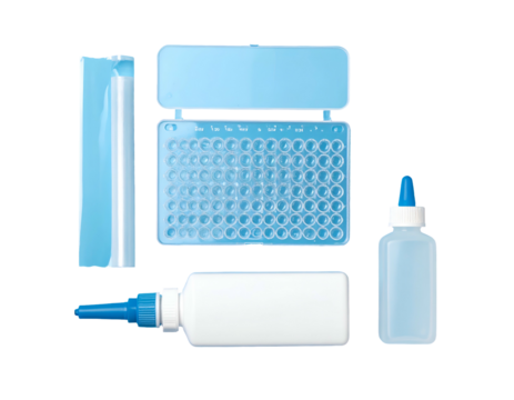 Collection Of Blue And White Science Laboratory Equipment Including Pipette Bottles And A Multi-Well Plate On A Transparent Background