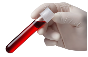 Scientist in lab coat and mask holding a test tube with blood sample isolated on transparent background