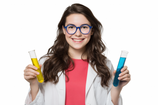 Young Scientist's Experiment: A bright young scientist, beaming with excitement, holds up two vibrant test tubes filled with colorful liquids.
