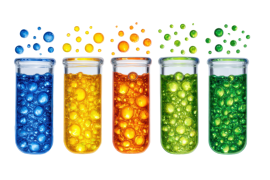 Colorful test tubes filled with vibrant liquids create a captivating display of hues showcasing scientific exploration and creativity isolated on transparent background